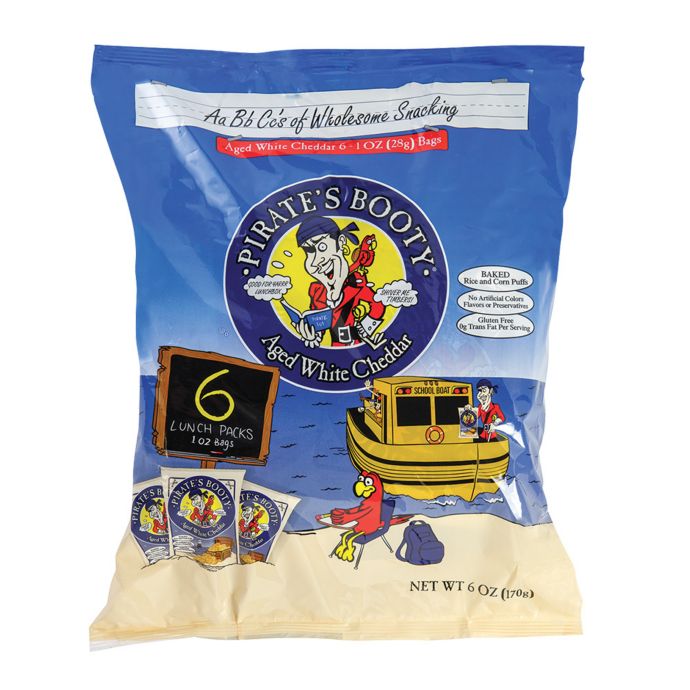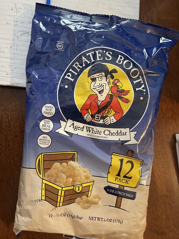 Pirate's Booty Aged White Cheddar Cheese Puffs - Walmart.com Pirate's Booty Aged White Cheddar Cheese Puffs contains 6 (1oz) snack bags. Perfect for lunches, on-the-go, or a break between video calls. Pirate's Booty Aged White Cheddar is made from puffed rice and corn, then blended with real aged white cheddar cheese and baked perfectly to pirate booty standards. Pirate Brands Pirates Booty Popcorn, 0.5 oz, White, 2 Pack Pirate's Booty Aged White Cheddar Cheese Puffs, 60ct, 0.5oz Individual Snack Size Bags, Gluten Free, Healthy Kids Snacks, 100 Calorie Snack Packs $28.00 ($0.12/Ounce) Welch's Fruit Snacks, Mixed Fruit, Gluten Free, Bulk Pack, 0.9 oz Individual Single Serve Bags 40 Count (Pack of 1) $7.48 ($0.19/Count)