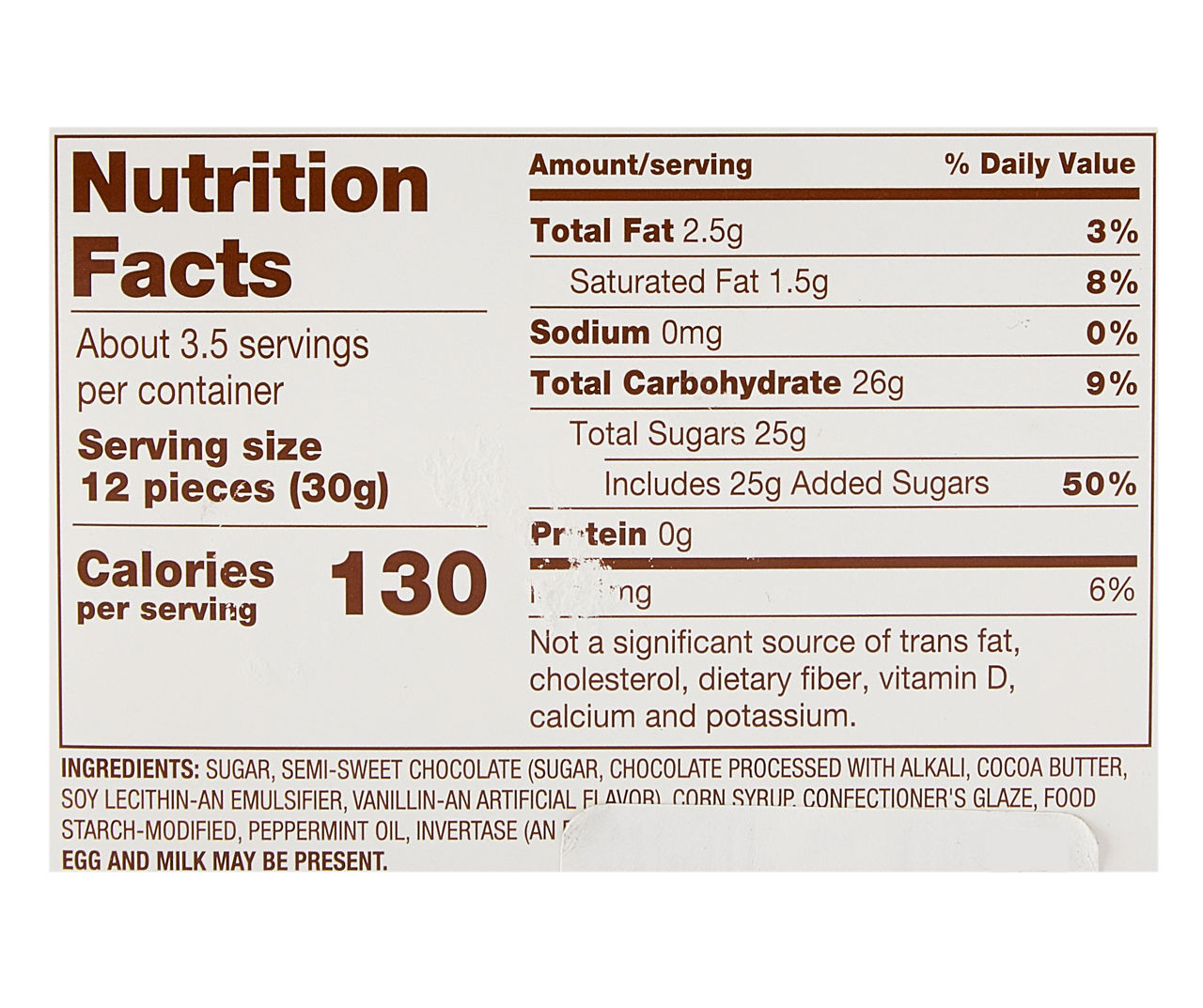 Calories in Junior Mints Minis and Nutrition Facts Junior Mints Minis Nutrition Facts Serving Size 42 pieces (30 g) Amount Per Serving Calories 130 % Daily Values* Total Fat 3.50g 4% Saturated Fat 2.000g 10% Trans Fat - Cholesterol - Sodium 0mg 0% Total Carbohydrate 26.00g 9% Dietary Fiber - Sugars 24.00g Protein 0.00g Vitamin D - Calcium - Iron - Potassium -