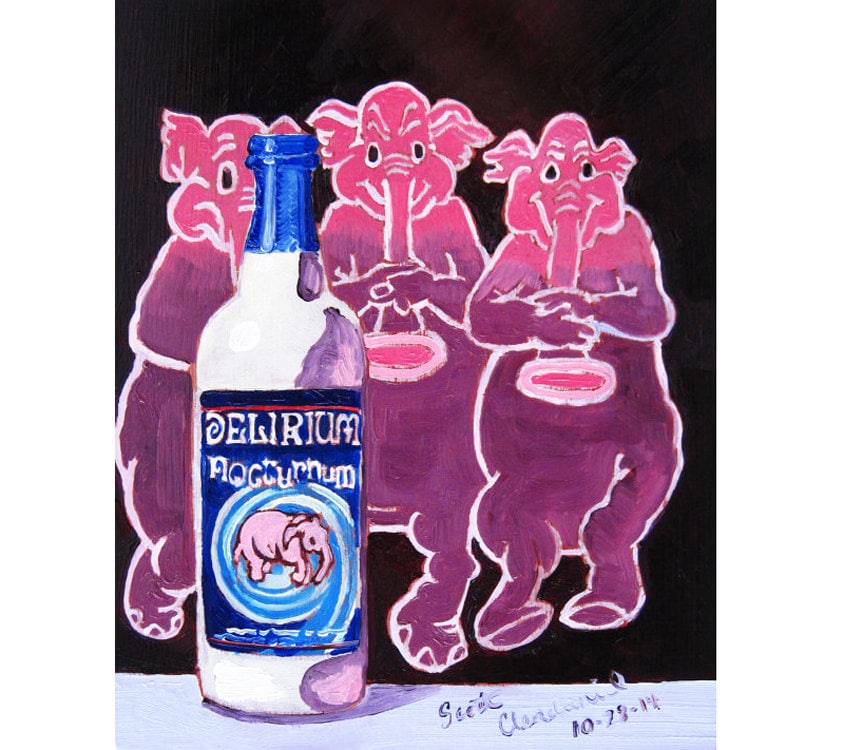 Delirium: The beer with the pink elephant | Beerwulf Pink elephant beer The legacy of the pink elephant The popularity of Delirium is not least due to its strong brand image, in particular the logo. You can recognise the soft blue background with the pink elephant anywhere. Like the name, the logo is a reference to a drug withdrawal phenomenon.