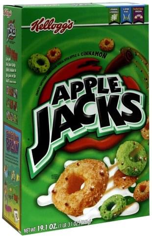 Calories in Apple Jacks® Cereal - Nutrition Facts - caloriegallery.com Kellogg's® Apple Jacks® Cereal are light in weight so you get a decent amount of cereal for 200 Calories Nutrition Facts Serving size = Calories % Daily Value More Nutrition Facts Carb - Protein - Fat Ratio 3.3% Protein ( 1.54 g) 4.6% Fat ( 1.03 g) 92.1% Carbohydrate ( 46.66 g) Caloric Density Calorie density = 3.9 Kellogg's Apple Jacks Breakfast Cereal - Shop Cereal ... - H-E-B 18.4 oz. $4.41 ($0.24/oz) Icon details. Product description. Start your day with Kellogg's Apple Jacks breakfast cereal and the crunch of delicious O's with the flavor of crisp apples and cinnamon. A low-fat breakfast cereal, Kellogg's Apple Jacks is a good source of vitamins and minerals. Not just for breakfast, Kellogg's Apple Jacks is a ...