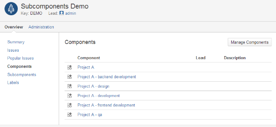 Subcomponents for Jira Cloud - Apps Documentation - Confluence After installing the app a new project tab "Subcomponents" is added to all your Jira projects. It is the home of components hierarchy for a particular project. If you are a project administrator you can create or change the hierarchy of the components. Users without project administrator permissions can explore the hierarchy of the components.