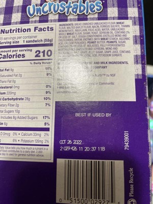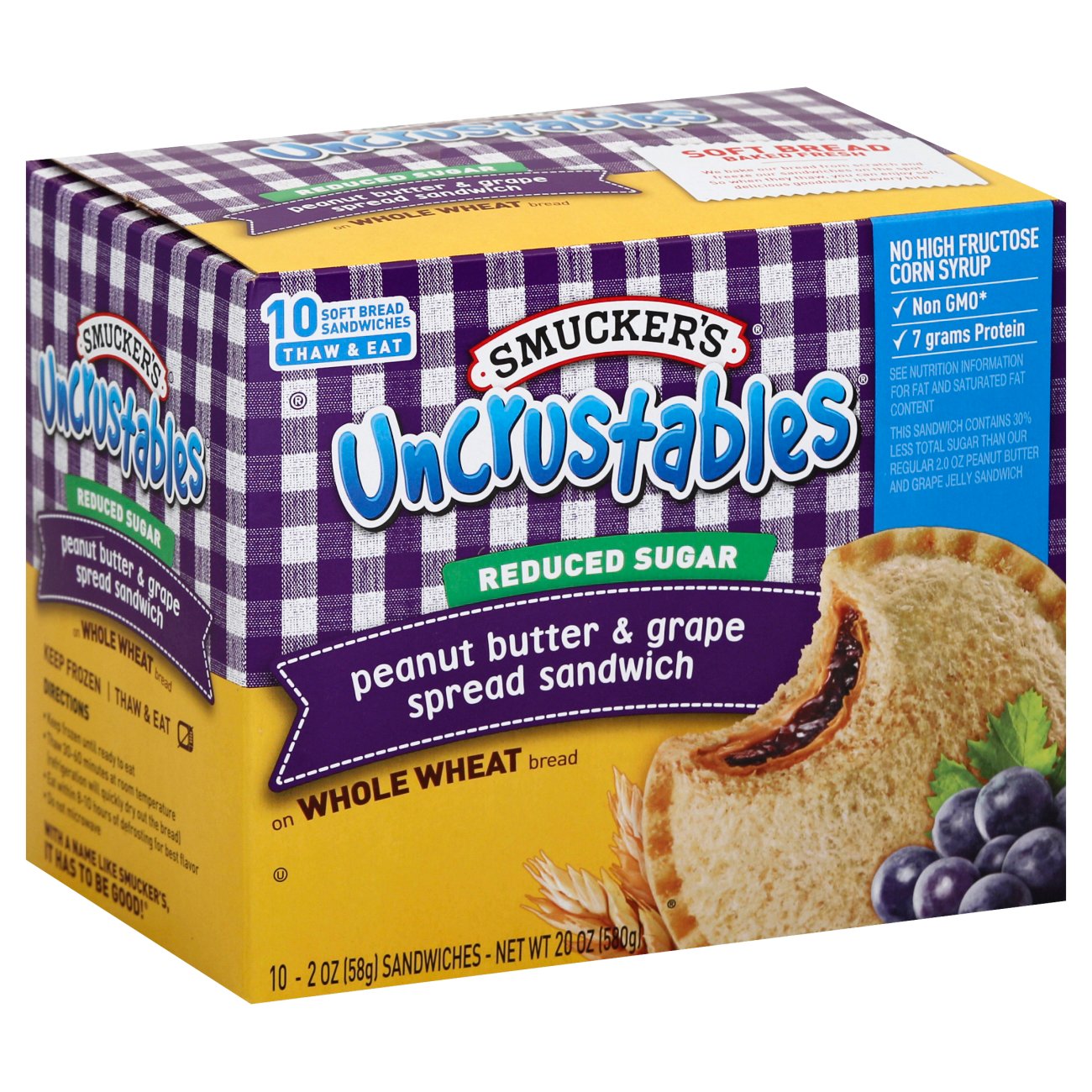 Smucker's Uncrustables Peanut Butter and Grape Jelly Sandwiches Uncrustables Peanut Butter and Grape Jelly Sandwiches 4 Serving Per Container Serving Size 1.00 sandwich (58g) Amount Per Serving % Daily Value* IS or Contains: Kosher,Wheat,Soy,Peanut *Percentage Daily values are based on a 2,000 calorie diet.Your Daily values may be higher or lower depending on your calorie needs
