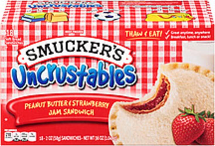 Calories in Smucker's Uncrustables, Peanut Butter & Strawberry Jam ... Calorie Breakdown. Where do the calories in Smucker's Uncrustables, Peanut Butter & Strawberry Jam Sandwich, frozen come from? 11.1% 51.6% 37.3% Protein Total Carbohydrate Total Fat 210 cal. * The % Daily Value (DV) tells you how much a nutrient in a serving of food contributes to a daily diet. 2,000 calories a day is used for general nutrition ...