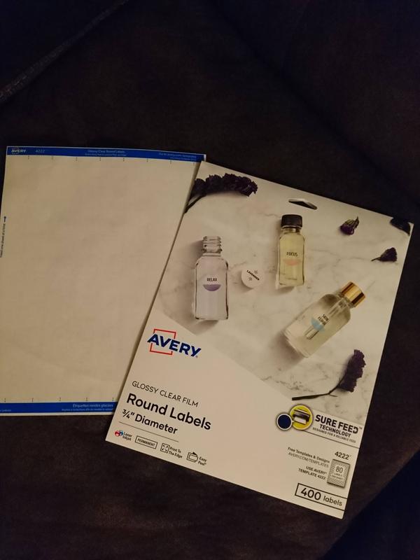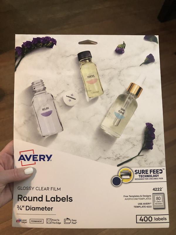 Avery Printable Round Labels with Sure Feed, 3/4" Diameter, Glossy ... This item: Avery Printable Round Labels with Sure Feed, 3/4" Diameter, Glossy Clear, 400 Customizable Labels (4222) $9.79 Avery Printable Round Labels with Sure Feed, 2" Diameter, Glossy Clear, 120 Customizable Labels (22825) $14.29 ($0.12/Count) Avery Printable Blank Square Labels, 2" x 2", Glossy Crystal Clear, 120 Customizable Labels (22853)