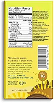 Lily's Sweets Lily's Sweets LESS SUGAR SWEET LIFE Not a low calorie food. Please see nutrition information for calorie, sugar, fat and saturated fat content. SWEETS REIMAGINED Changing the sweets game. One bite at a time. Here at Lily's, we LOVE sweets. We think they should be for everyone, regardless of your diet or craving. Amazon.com : Lindt Excellence Bar, 90% Cocoa Supreme Dark ... Rich, full-bodied dark chocolate featuring notes of red currants, leather and roasted nuts : Rich, premium dark chocolate, delicate orange pieces and crisp almond slivers : Rich dark chocolate flavor enhanced with Fleur de Sel sea salt crystals (hand-harvested French sea salt) Cocoa % 90% : 85% : 70% : 47% : 47% Lily's Dark Chocolate Bar with Stevia, Original, 3 Ounce (Pack of 12) Lily's stevia-sweetened chocolate has all the indulgence you crave but with a lot fewer calories. We use only the finest non-GMO ingredients, including genuine, Fair Trade certified cocoa. As an extra bonus, all Lily's bars and baking chips are now certified gluten-free. At Lily's we're committed to making great tasting chocolate better ... Nutrition Facts for Lily's Hazelnut Milk Chocolate Style Bar Nutrition Facts. Serving Size. bar. 0.4 bar = 30g. Amount Per Serving. 140. Calories % Daily Value* 18%. Total Fat 12g. 30% Saturated Fat 6g Trans Fat 0g. 1%. Cholesterol 3mg. 0%. Sodium 5mg. 5%. Total Carbohydrate 14g. 29%. Dietary Fiber 8g Total Sugars 0.5g. 0%. Includes 0g Added Sugars. Sugar Alcohols 4g ... Lily's Creamy Milk Chocolate Bar ...