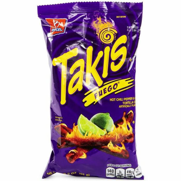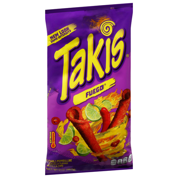 Takis Fuego Hot Chili Pepper & Lime Rolled Tortilla Chips Fiesta Size Takis Fuego Hot Chili Pepper & Lime Rolled Tortilla Chips Fiesta Size. 20 oz. $5.13 ($0.26/oz) Product description. Mix-up how you snack with Takis Fuego Rolled Tortilla Chips and give your taste buds the gift of launching into an unexplored universe of sensational flavor combinations. We know hunger can strike at a moment's notice, creating an ...
