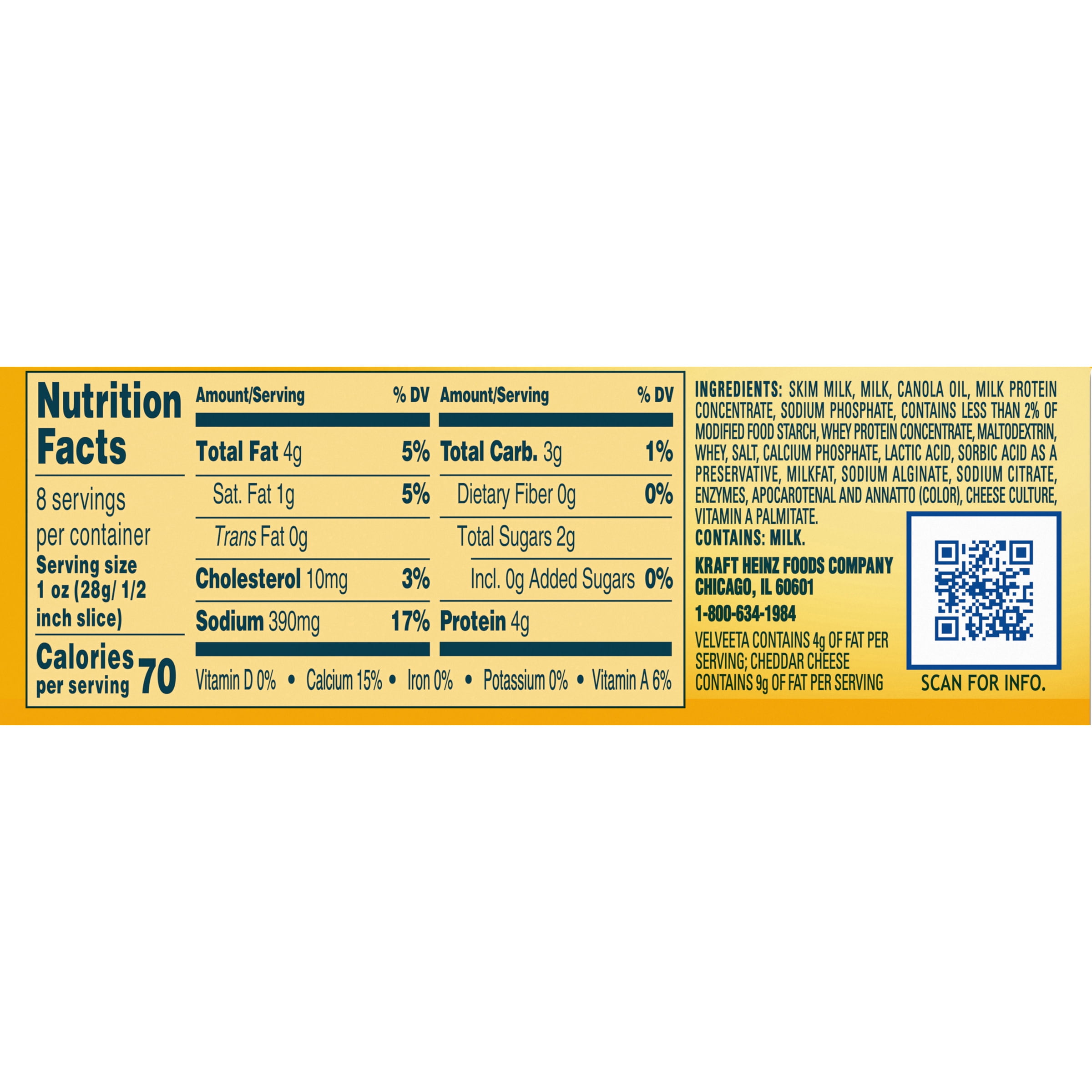 Velveeta cheese block nutrition facts. Velveeta: Official Nutrition Facts (2023 Review & Summary) Nutrition Facts Summary for Velveeta Due to the balance of carbohydrates, fats and proteins, Velveeta is not recommended for ketogenic diets. Also, it has a very high lactose content (above 7g/100g) which can be very problematic for people who are lactose intolerant. Velveeta Liquid Gold Cheese Original Block - Martin's Foods See nutrition information for sodium content. Melts better & 50% less fat than cheddar cheese. Good source of calcium. SmartLabel: Scan for more food information. Call 1-800-634-1984 for more food information. Visit us at: velveeta.com. 1-800-634-1984, please have package available. After opening, refrigerate up to 8 weeks, do not freeze. Calories in Velveeta Block, Mexican Hot | CalorieKing Where do the calories in Velveeta Block, Mexican Hot come from? 14.0% 62.8% 23.3% Total Carbohydrate Total Fat Protein 90 cal * The % Daily Value (DV) tells you how much a nutrient in a serving of food contributes to a daily diet. 2,000 calories a day is used for general nutrition advice. Velveeta Classic Size Original Cheese Block, 32 oz - Fred Meyer The Velveeta taste you know and love is packed in this soft pasteurized recipe cheese product block that you can slice and melt whenever your family craves a touch of cheesy goodness. Plus, this original cheese loaf has 50% less fat than cheddar cheese so you can enjoy even more cheesy, delicious meals.
