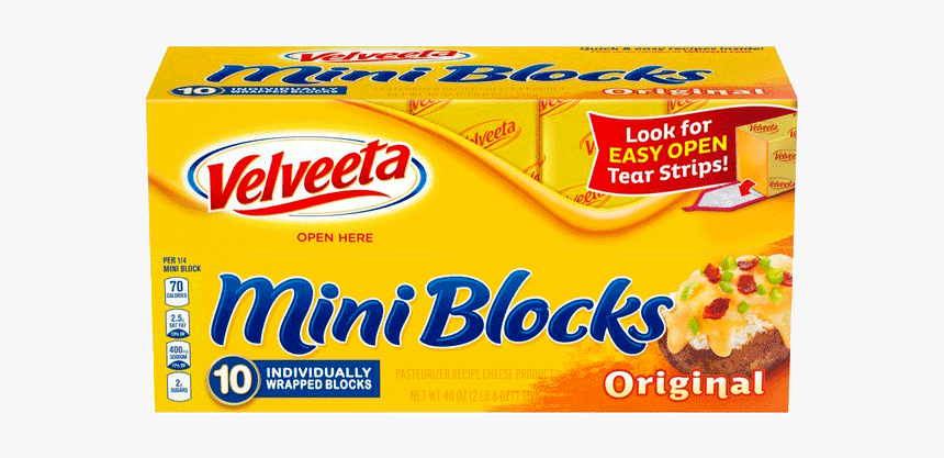 Velveeta Original Mini Cheese Block: Calories & Nutrition Facts ... Nutrition Summary There are 70 calories in a 1/4 mini block serving of Velveeta Original Mini Cheese Block. Calorie breakdown: 56.3% fat, 18.8% carbs, 25.0% protein. * DI: Recommended Daily Intake based on 2000 calories diet. Calorie Burn Time How long would it take to burn off 70 calories of Velveeta Original Mini Cheese Block ? Swimming 6 minutes Velveeta Classic Size Original Cheese Block, 32 oz - Kroger Nutrition Facts servings per container Serving size 1oz (28 g) Amount per serving Calories 70 % Daily value* Total Fat 4g 5.13% Saturated Fat 1g 5% Trans Fat 0g Cholesterol 10mg 3.33% Sodium 390mg 16.96% Total Carbohydrate 3g 1.09% Dietary Fiber 0g 0% Sugar 2g Added Sugar 0g 0% Protein 4g Calcium 230mg 20% Iron 0mg 0% Potassium 0mg 0%