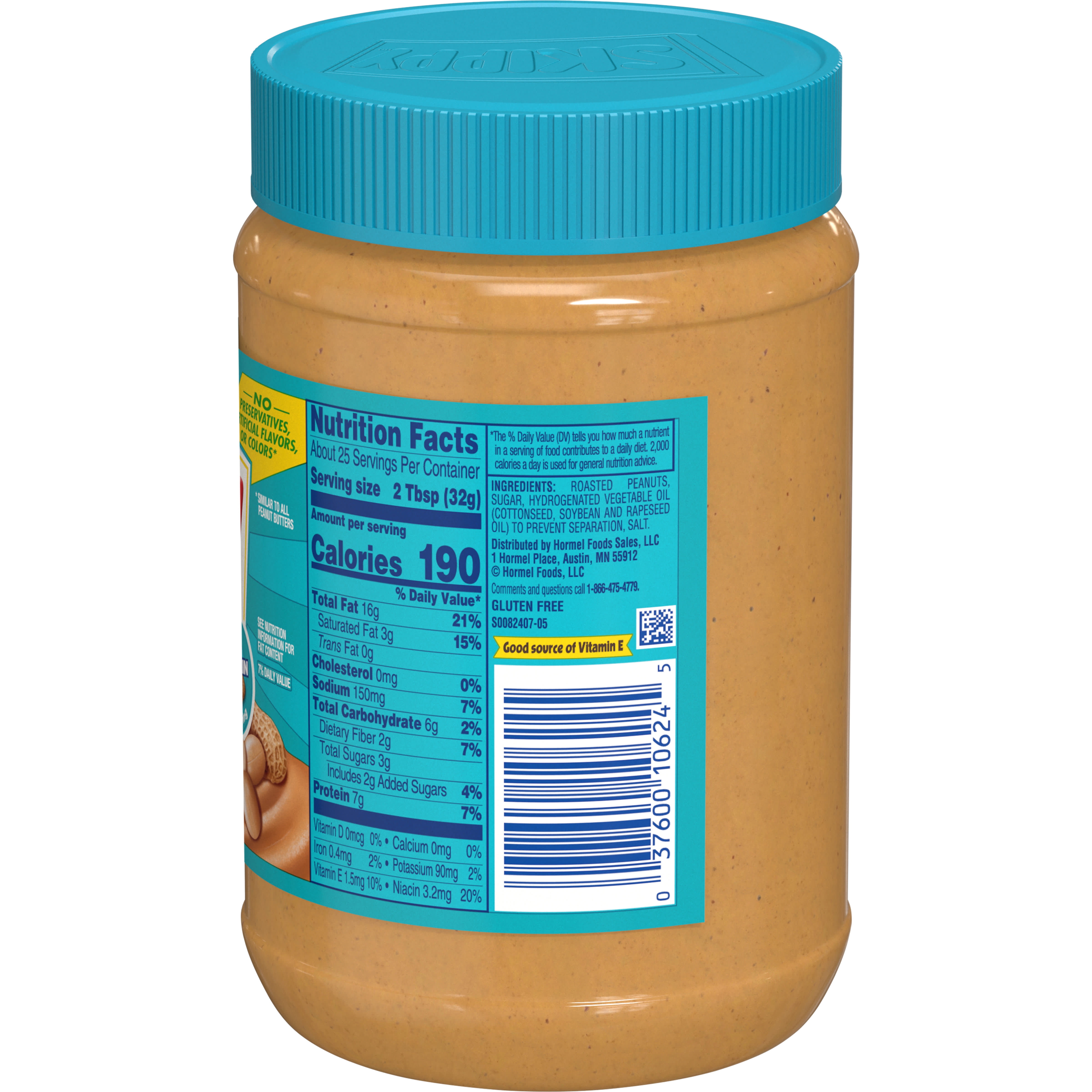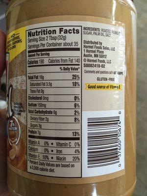 Skippy peanut butter nutrition facts label. Calories in Skippy Creamy Peanut Butter and Nutrition Facts - FatSecret Skippy Creamy Peanut Butter Nutrition Facts Serving Size 2 tbsp (32 g) Amount Per Serving Calories 190 % Daily Values* Total Fat 16.00g 21% Saturated Fat 3.000g 15% Trans Fat 0.000g Cholesterol 0mg 0% Sodium 150mg 7% Total Carbohydrate 6.00g 2% Dietary Fiber 2.0g 7% Sugars 3.00g Includes 3.00g Added Sugars 6% Protein 7.00g Vitamin D 0mcg 0% Calcium Calories in Skippy Extra Crunchy Super Chunk Peanut Butter and ... Skippy Extra Crunchy Super Chunk Peanut Butter Nutrition Facts Serving Size 2 tbsp (32 g) Amount Per Serving Calories 190 % Daily Values* Total Fat 16.00g 21% Saturated Fat 3.000g 15% Trans Fat 0.000g Cholesterol 0mg 0% Sodium 125mg 5% Total Carbohydrate 6.00g 2% Dietary Fiber 2.0g 7% Sugars 3.00g Includes 2.00g Added Sugars 4% Protein 7.00g Calories in Skippy Natural Creamy Peanut Butter and Nutrition Facts Skippy Natural Creamy Peanut Butter Nutrition Facts Serving Size 2 tbsp (32 g) Amount Per Serving Calories 190 % Daily Values* Total Fat 16.00g 21% Saturated Fat 3.500g 18% Trans Fat 0.000g Cholesterol 0mg 0% Sodium 150mg 7% Total Carbohydrate 6.00g 2% Dietary Fiber 2.0g 7% Sugars 3.00g Includes 2.00g Added Sugars 4% Protein 7.00g Vitamin D 0mcg 0% Peanut Butter Nutrition Facts and Health Benefits - Verywell Fit Peanut Butter Nutrition Facts. Peanut butter nutrition includes 190 calories per 2 tablespoon serving, with 16g of fat, 8g of carbs, 2g of fiber, and 7g of protein. Peanut butter is high in healthy fats, folate, potassium, vitamin E, and B vitamins. The following nutrition information is provided by the USDA for 2 tablespoons (32g) of smooth ...